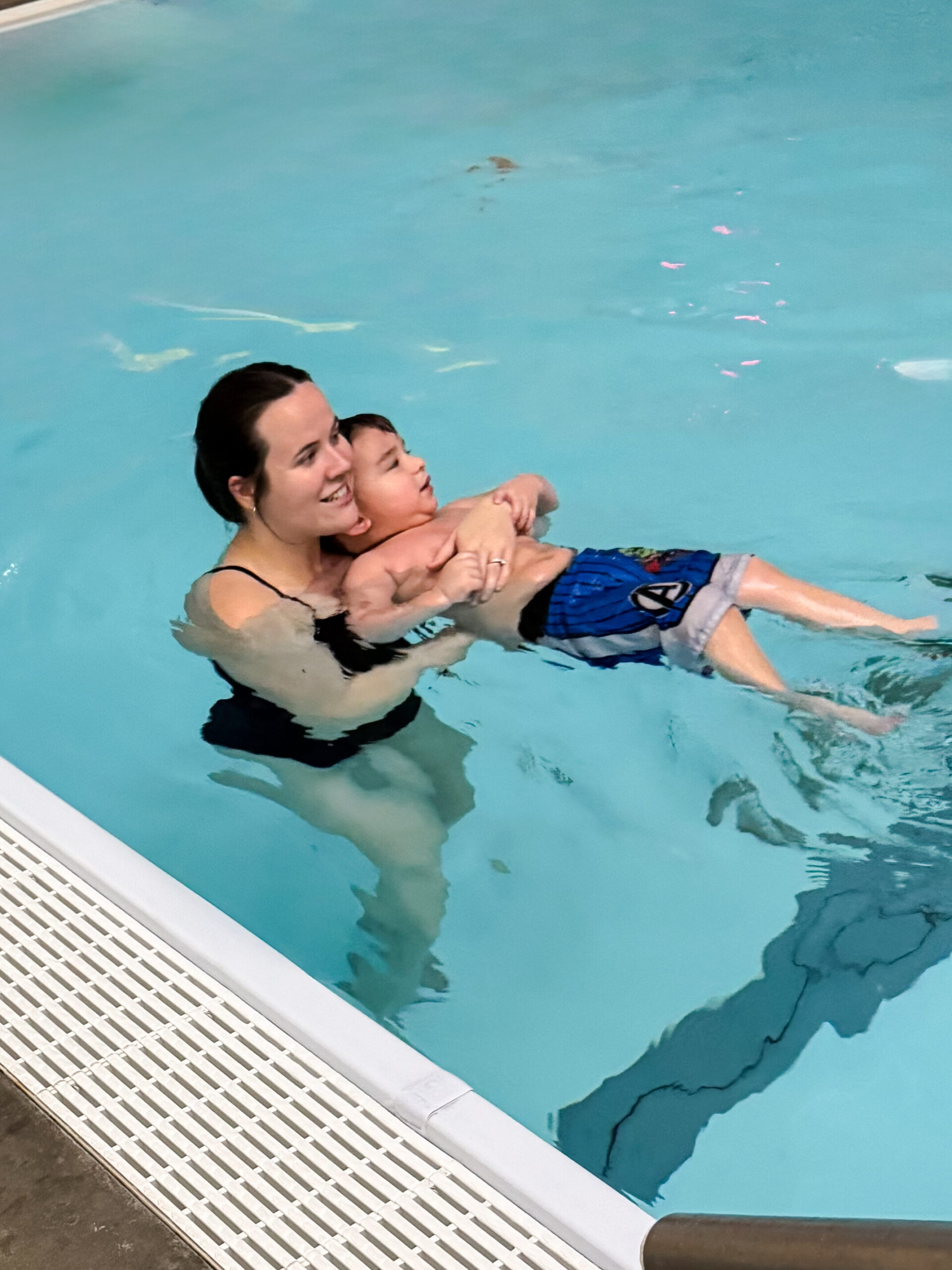 A small group of 2-3 children in the water with one instructor at a time. Group activities and individual practice, while other students have an opportunity to rest or practice learned skills on the steps.
